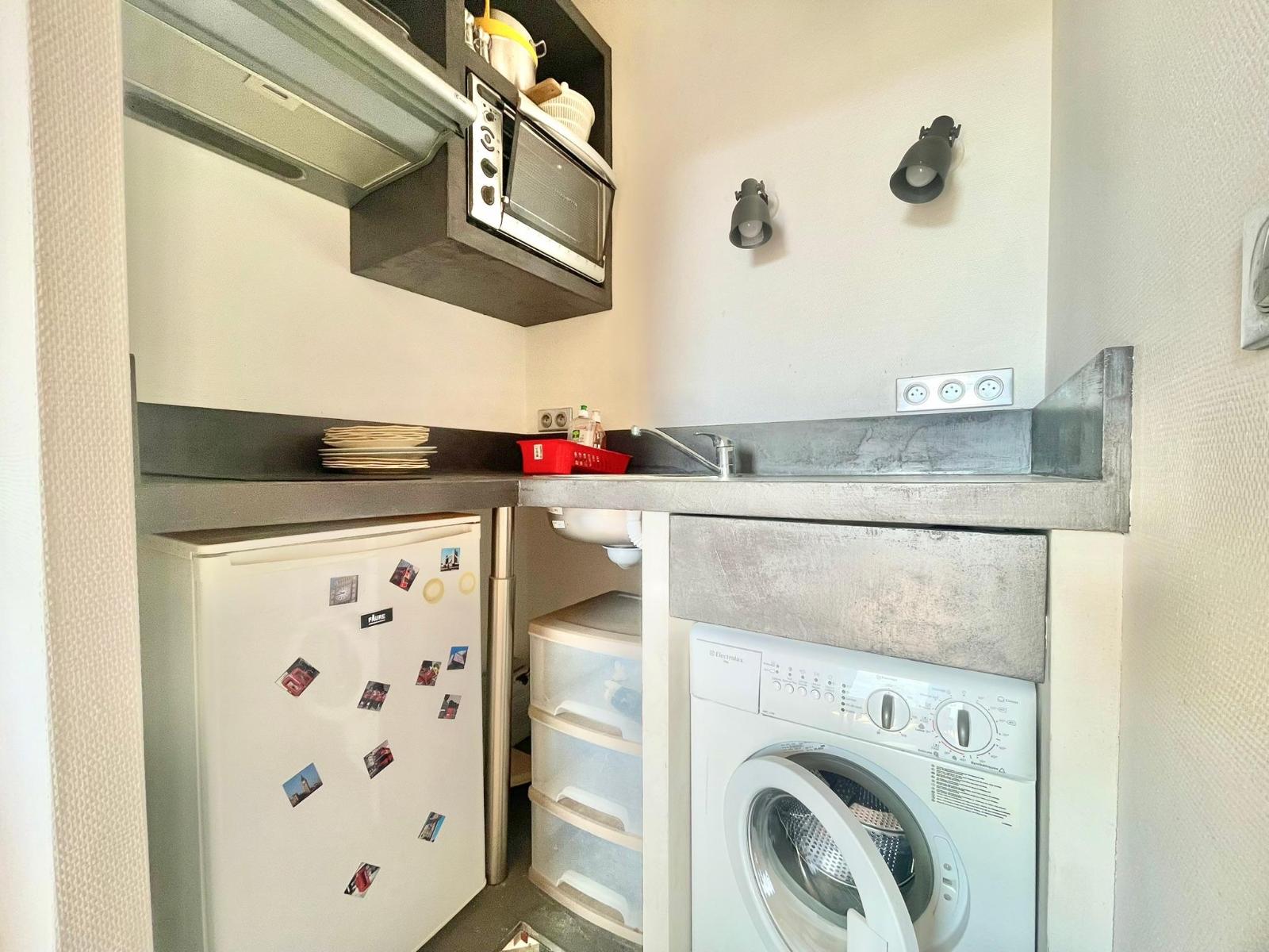 Il dispose d’une pièce de vie lumineuse intégrant une décoration années 70, une kitchenette, une chambre avec placard, une salle de bain et WC séparé.